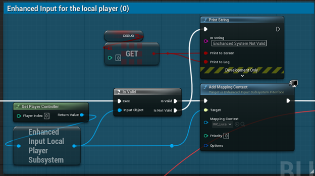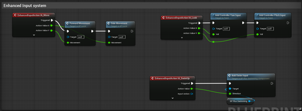 Then the blueprint script to trigger these inputs are very simple, just add the mapping context to the player controller when initializing the game and then just use the enhanced input event to trigger the add movement scripts.