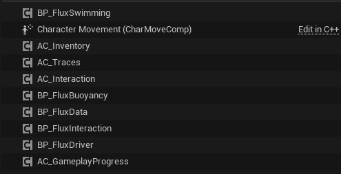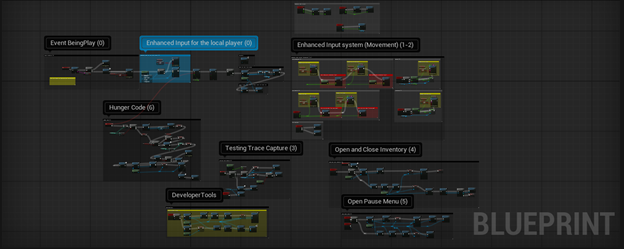 Starting with the player character blueprint, this holds, currently, all the information about the player itself. How the player can move, what movement type the player is currently in (swimming, falling, walking, and so on), stats about the player (hunger, health, inventory contents), and widgets (Unreal Engines form of a UI system) that can be accessed from the player.