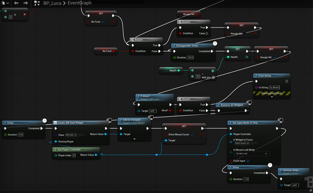 The lowering health is a bit different because I wanted a longer time in-between than 18 seconds if the health should be lower, to give the player a bit extra time to eat. To achieve this while still calling the function every 18 seconds, I have a retriggable delay (when triggered a retriggable delay restarts its countdown or delay) that is only triggered if the hunger is above 0, if it is not above 0 the delay will not be triggered which allows the input to go through and lower the health.