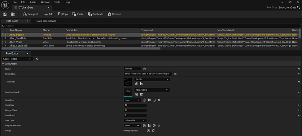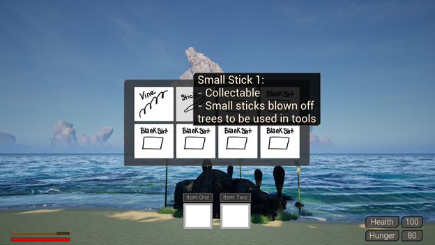 There is another data table being used to display all the correct information. Each row of this data table is set up with a structure as well that holds all the information for each specific item. Things like item name, max stack size, thumbnail, if it’s food, or equipment, if it is craftable what is its recipe. Each interactable item in the game has to have its own row inside this data table. Here is where the system really starts to work well, Using the name from each inventory slot from the inventory array we can get the row that corresponds to that name. This gives all the information required for each inventory slot, this information is what generates the pictures and the tooltips for each item as shown below.