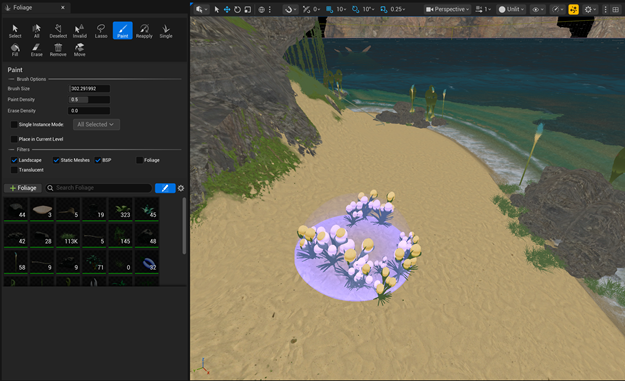 The next more interesting part of this system is the interaction between the player and objects in the game world. I used something called foliage instanced static mesh component of FISMC for short. This adds a specific component to each instance of the foliage. The foliage was placed by the Unreal Engine foliage painter tool, which allows me to create foliage types and paint them into the world. It is extremely efficient way of having thousands of interactable items at the same time.