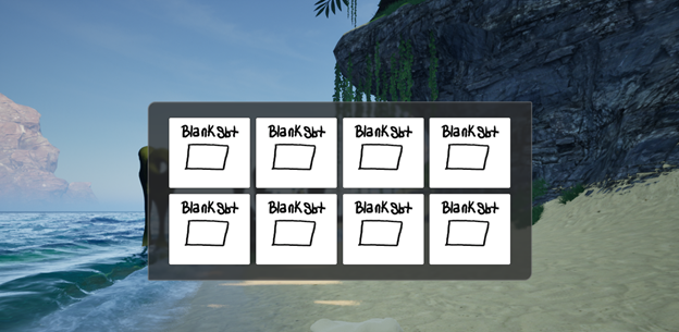 These next systems are by far the most complicated systems currently in the game. We will first start with an overview of the actual inventory system itself. The inventory is store inside an array in the AC_Inventory component on the player character. The array’s elements are a structure which was created separately that holds the item name and quantity, this represents each item inside the inventory on a per slot bases. The inventory grid, which is what is displayed to the character, takes this inventory array and for each element adds a child to the grid component inside the inventory grid. This creates that 2by4 grid shown below, as the default number of inventory slots is 8.